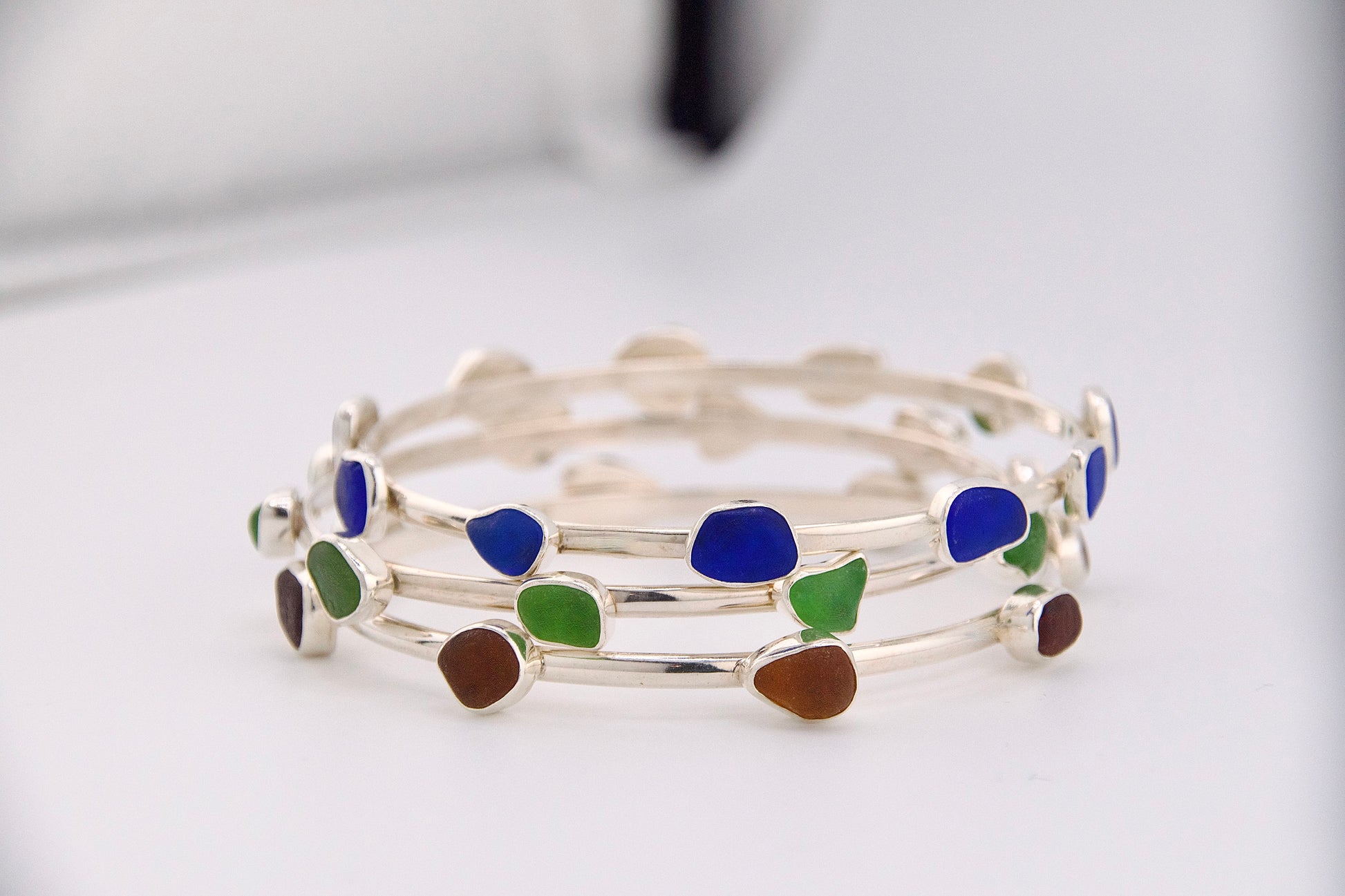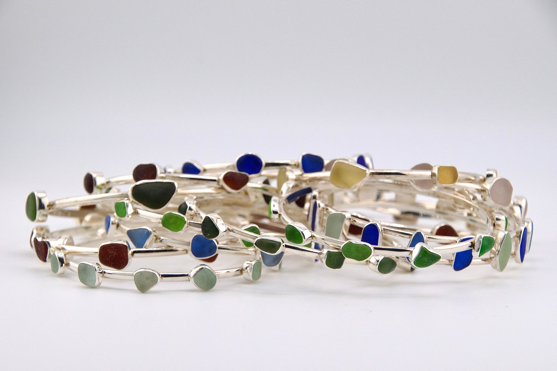 sterling silver bangle bracelet with 11 shards of rare cobalt blue sea glass. layer several bangles for a great look! (7.8" round/2.5" diameter)