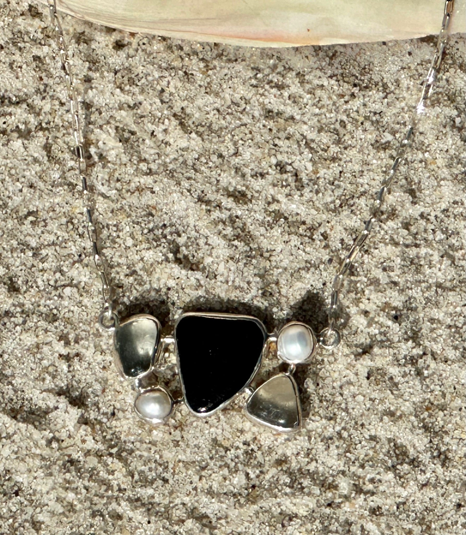 beautiful black and grey sea glass and pearls are bezeled and linked to an 18" small-link paperclip chain. (1.25" W)
