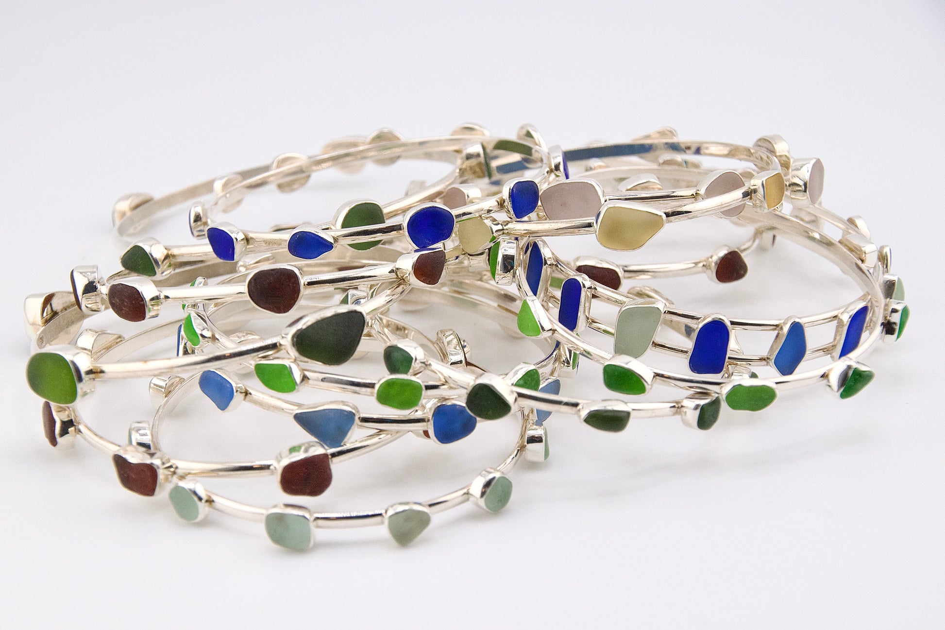 this unique sterling silver double bangle bracelet has 15 chards of sea foam and rare cobalt and cornflower blue sea glass! (7.8" round/2.5" diameter x .5" wide)